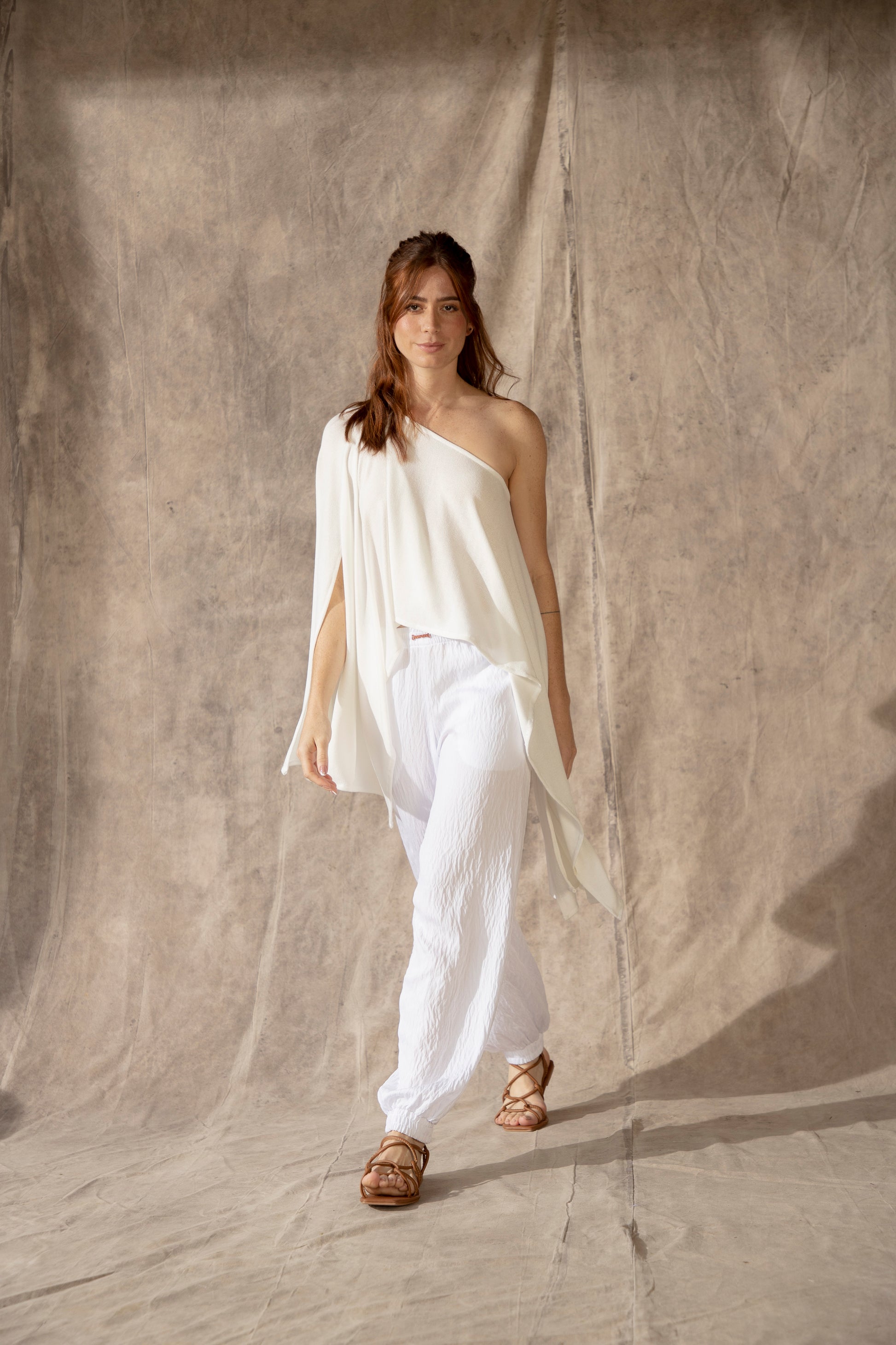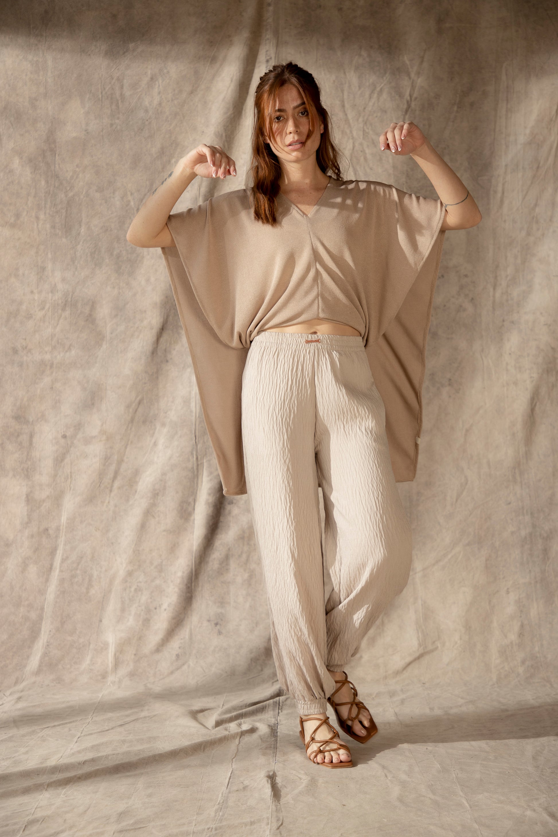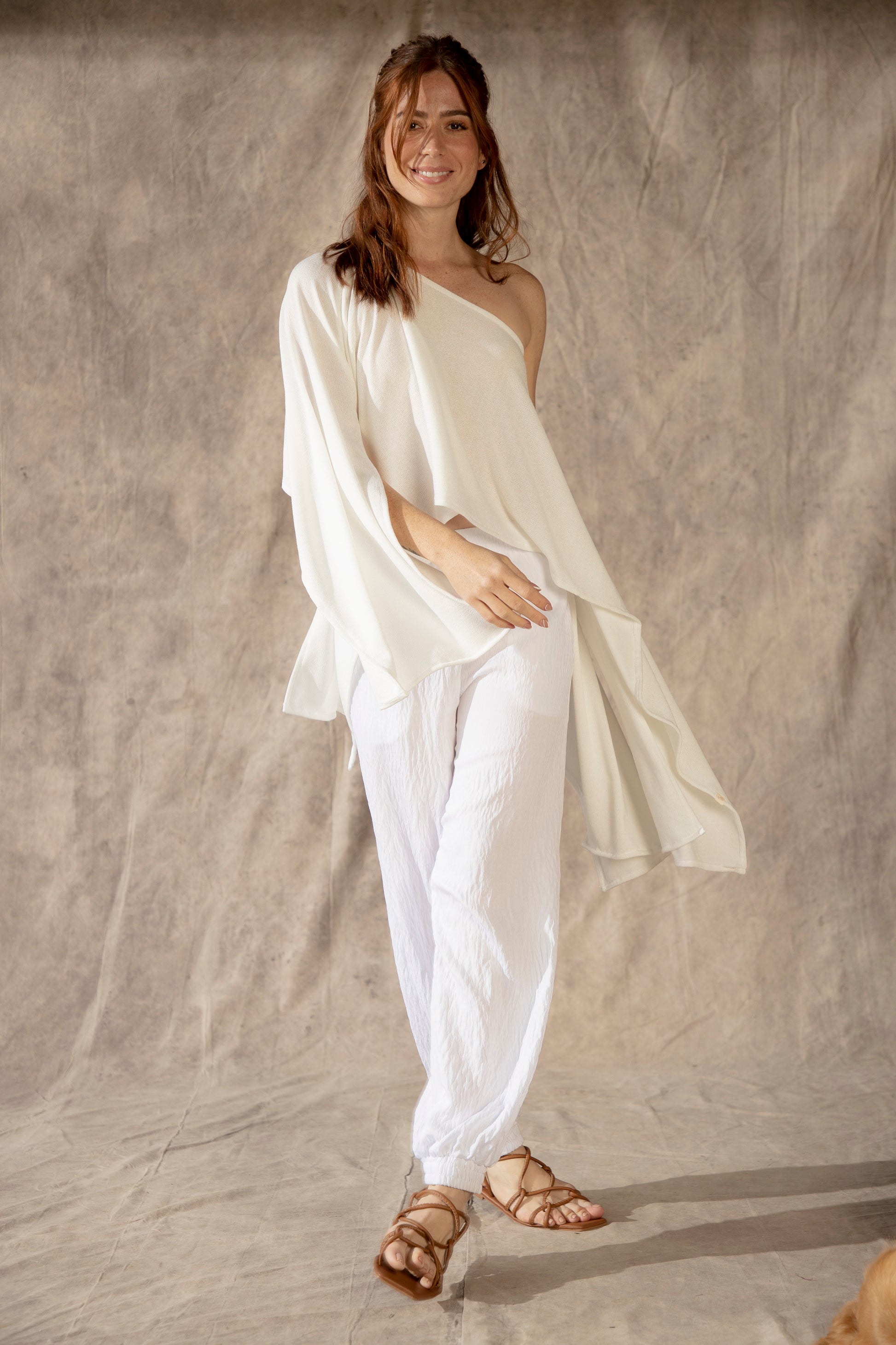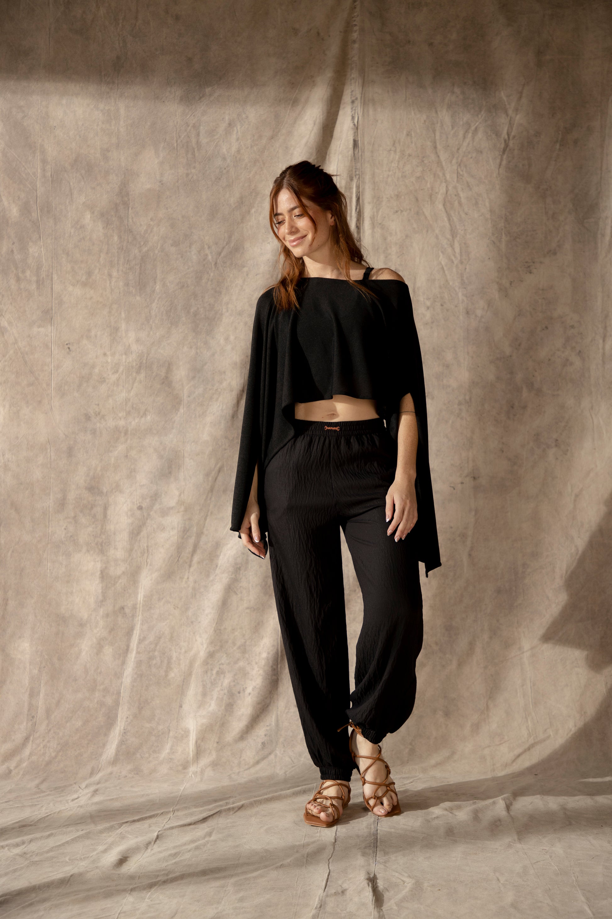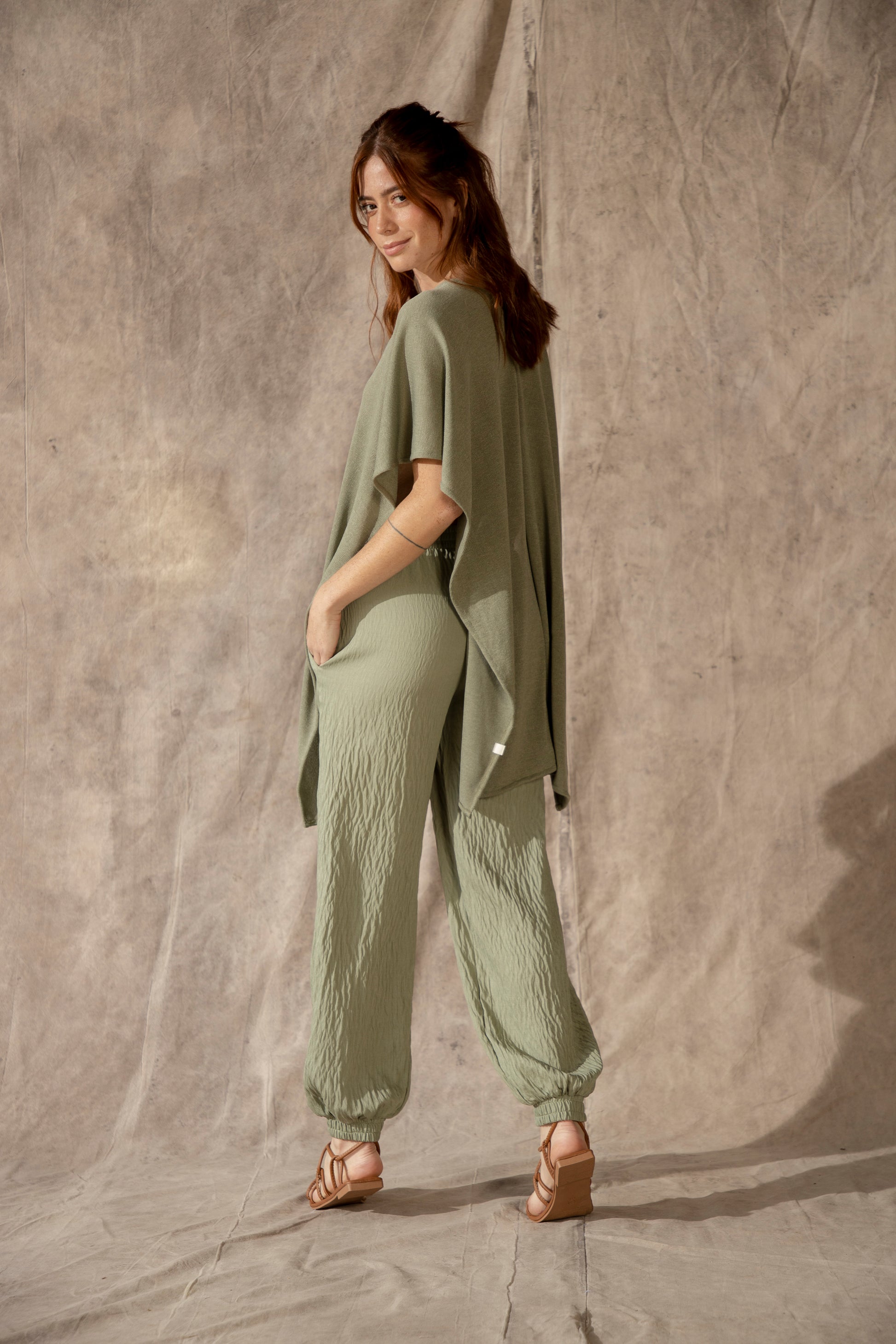 Nuestra prenda tejida tipo capa es versátil y funcional. Su diseño permite múltiples formas de uso: sobre los hombros, cruzada, tipo chal o como capa ligera. Ideal para crear diferentes looks con una sola pieza.