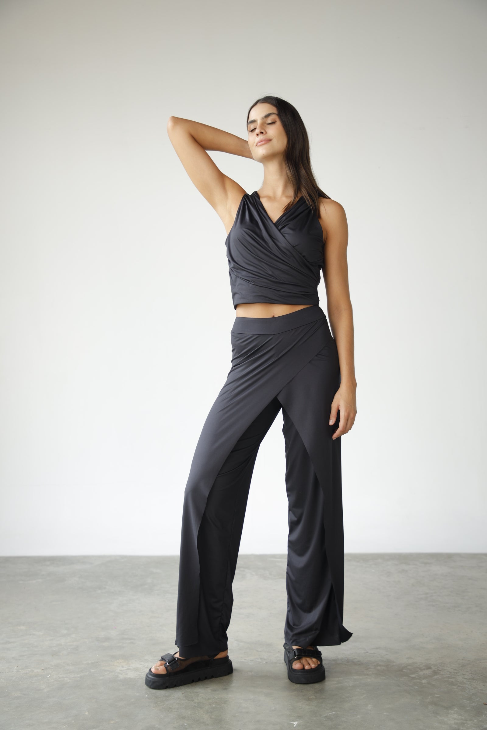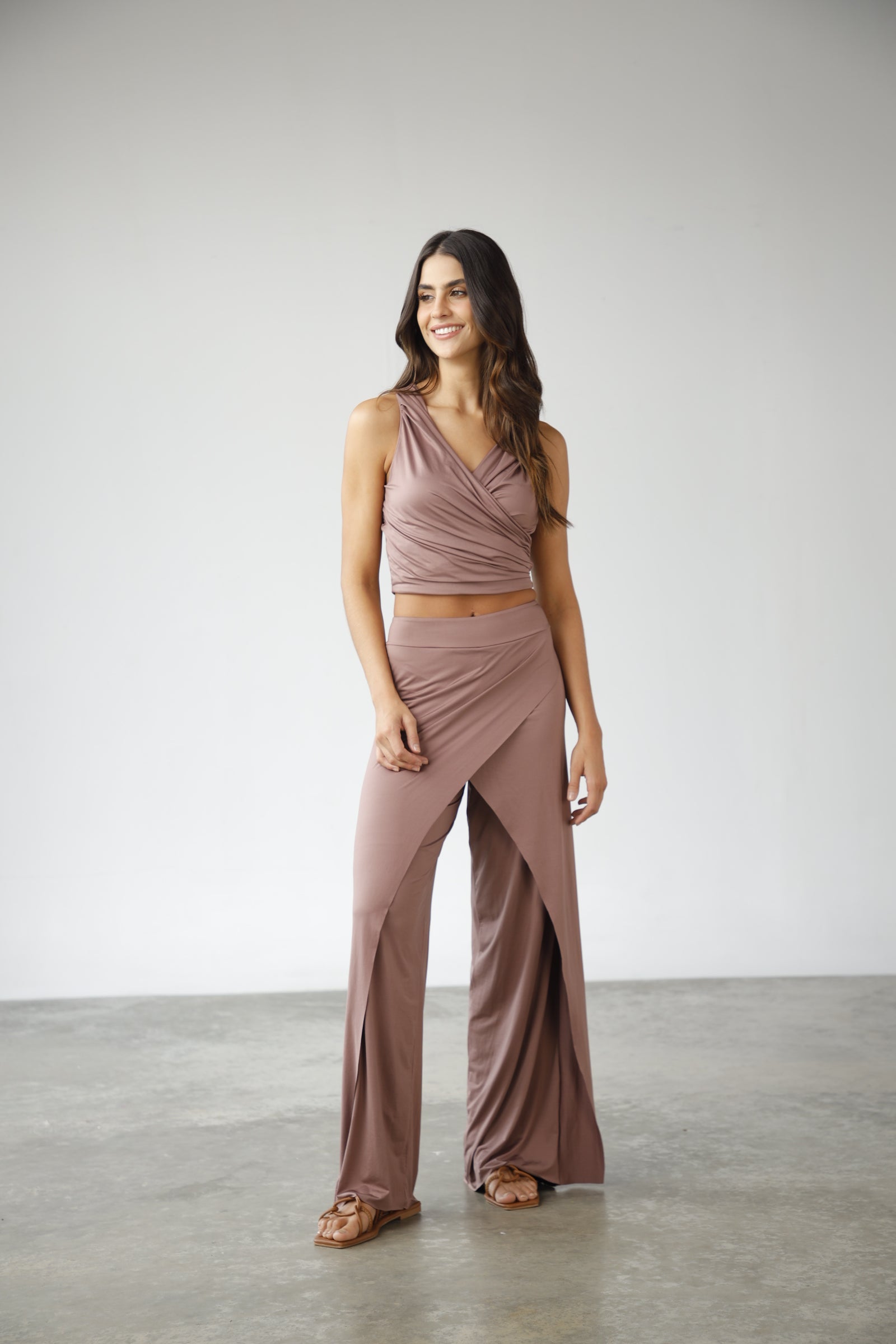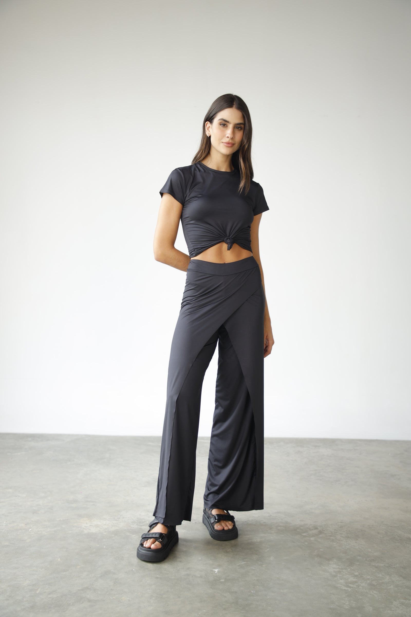Este pantalón pañuelo, con capas cruzadas en el frente y short interno, te da seguridad y libertad de movimiento. Ligero y amplio, es perfecto para combinar con tenis, sandalias, botas o tacones, adaptándose a cualquier ocasión.