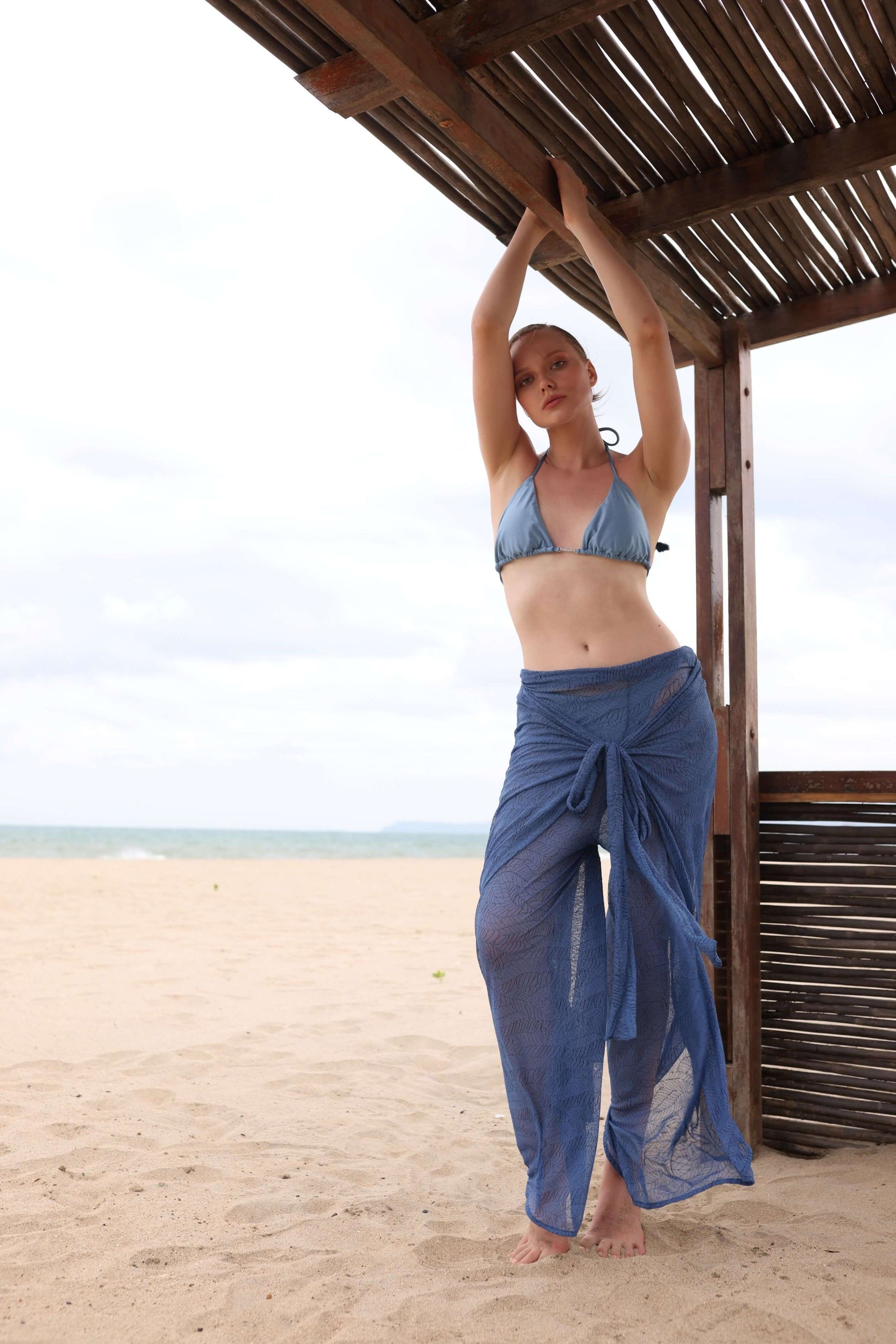 Este pantalón enfatiza la simplicidad y la libertad, ideal para disfrutar de la playa, la piscina o el descanso en casa. Confeccionado en tejidos ecológicos, ofrece ligereza y suavidad para tus momentos de relax. Su característica distintiva son las tiras frontales, diseñadas para un ajuste personalizado mediante un nudo o moño, añadiendo un toque de estilo único.